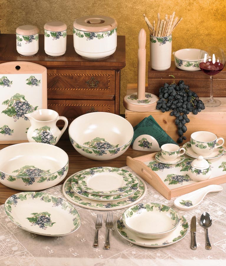 Il tema del'uva è un elemento che si sposa bene con qualsiasi tipo di cucina country e classica, con un gusto caldo tutto italiano.