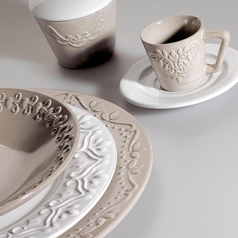 Il servizio piatti della collezione Vittoria di Topgres è ispirata allo stile shabby chic. In tavola regala l'atmosfera che rimembra il fascino del passato, avvolgendola di un'area intrisa di mistero e romanticismo.